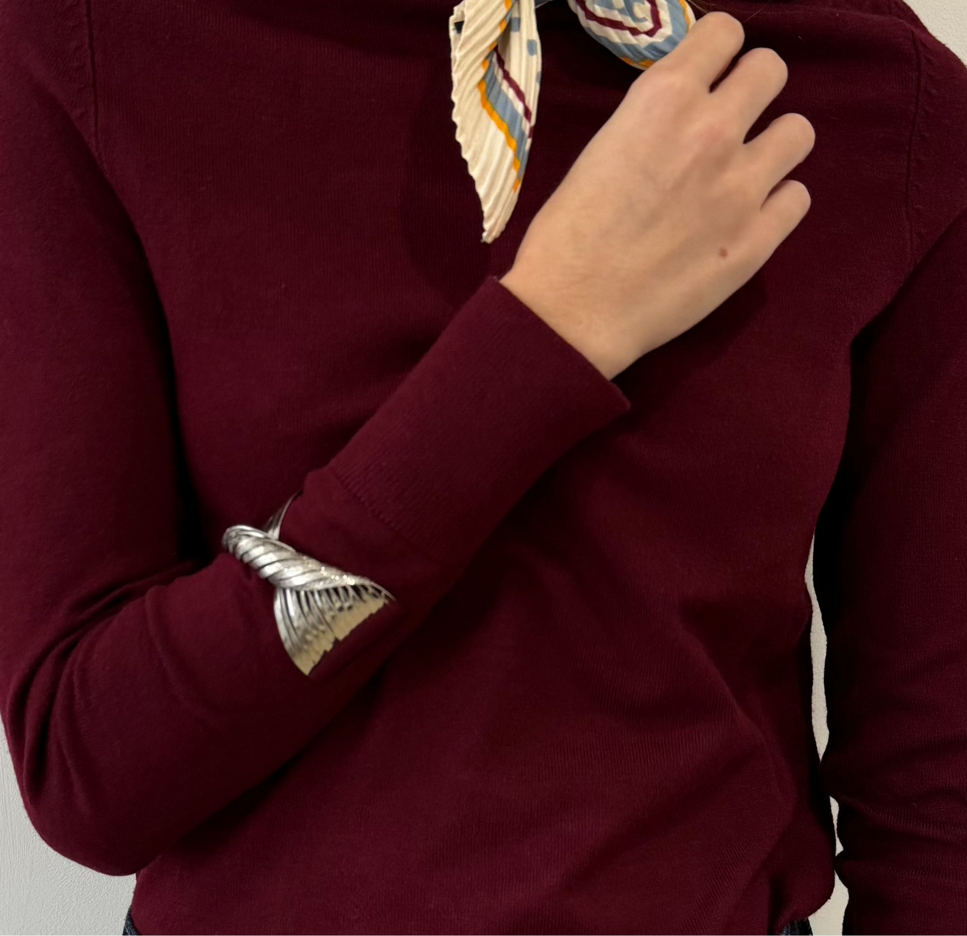 - Plata: Aporta un contraste fresco, ideal para looks más modernos y minimalistas. Combina brazaletes de plata con prendas granate para un toque chic.