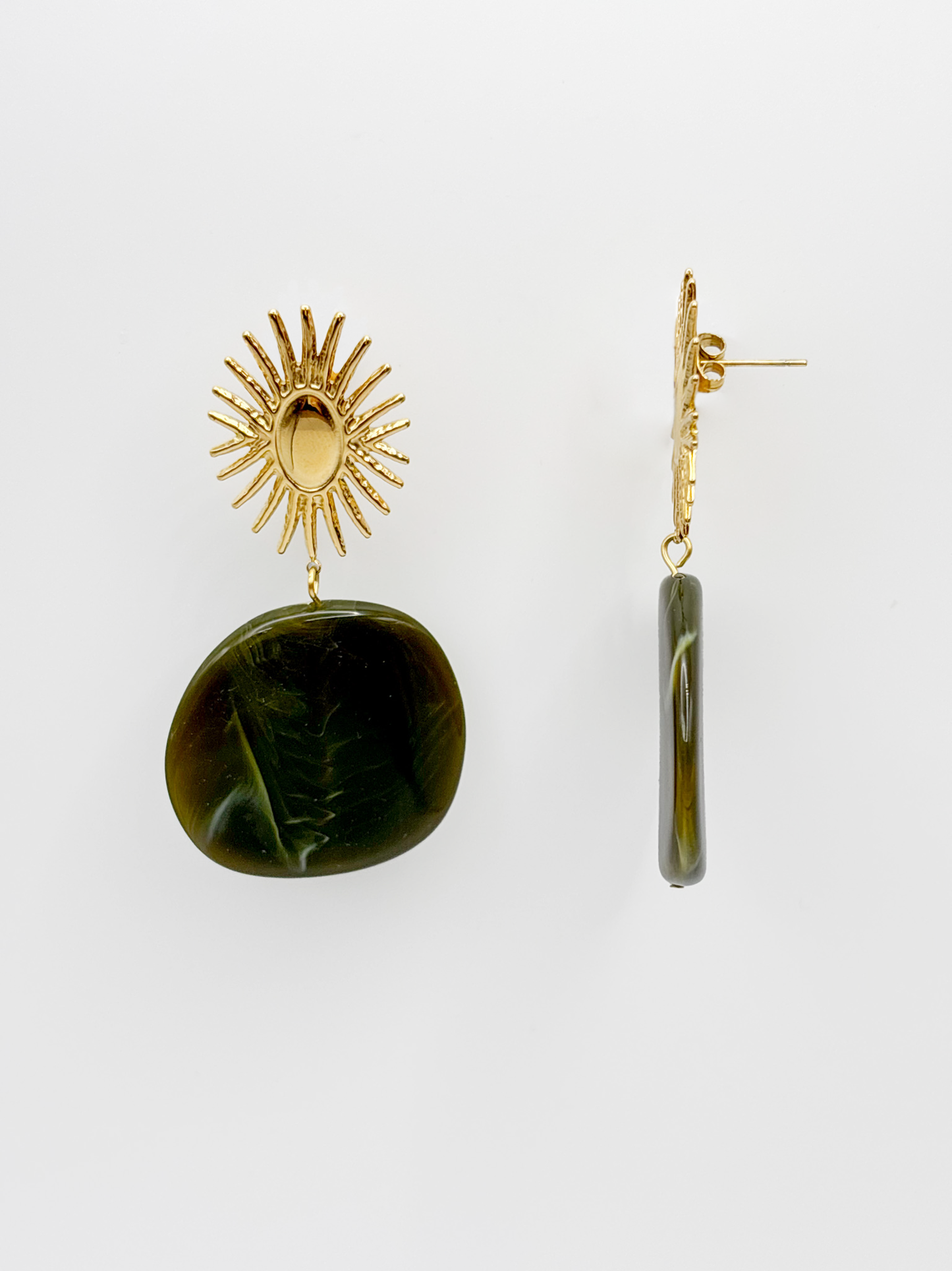 Pendientes largos con diseño de sol dorado y piedra de resina verde oscura, que aportan elegancia y estilo único. Perfectos para complementar looks sofisticados.