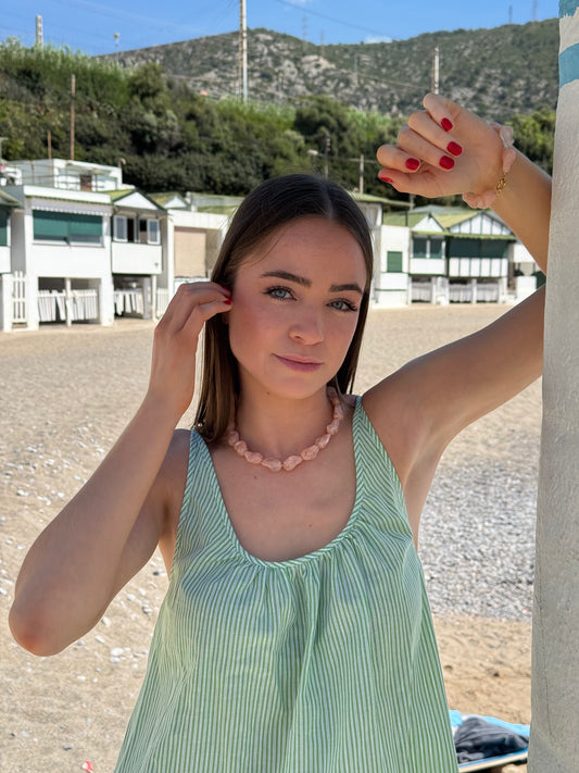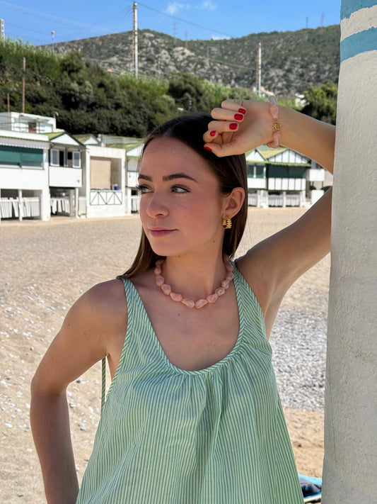Pulsera artesanal con cuentas irregulares y detalles dorados, ideal para un look elegante y veraniego.