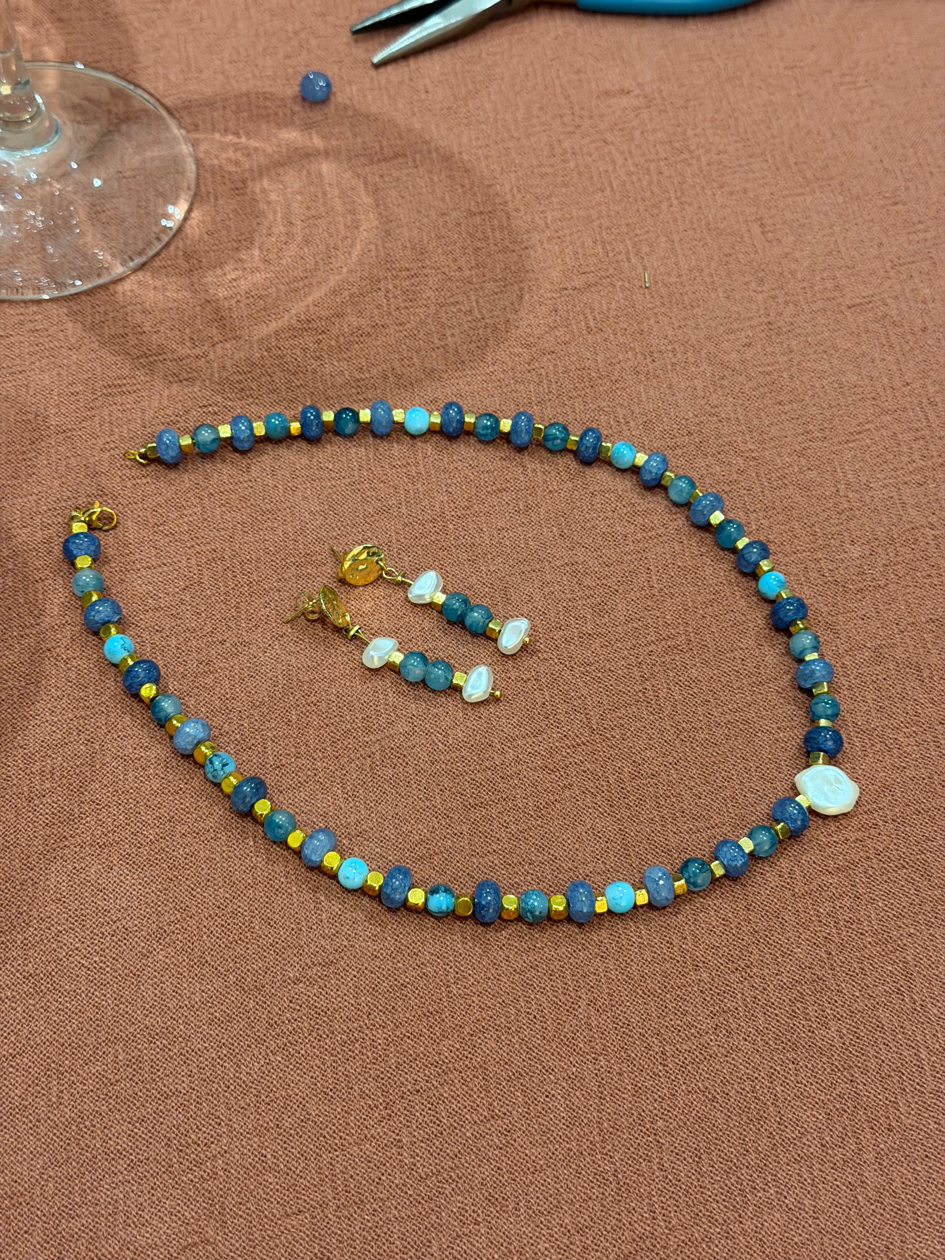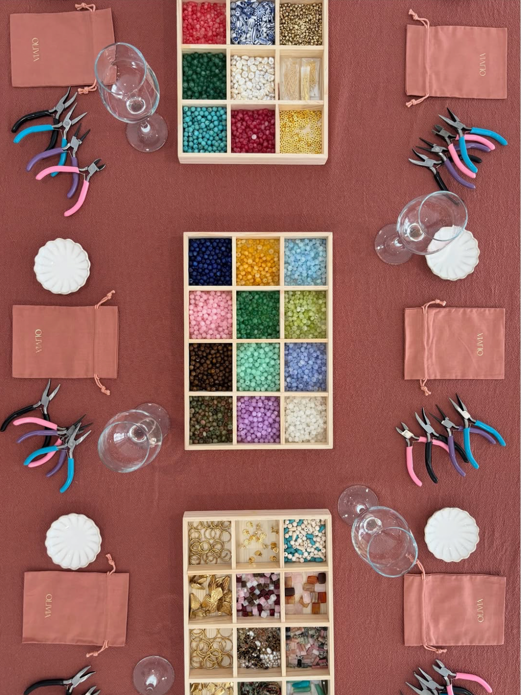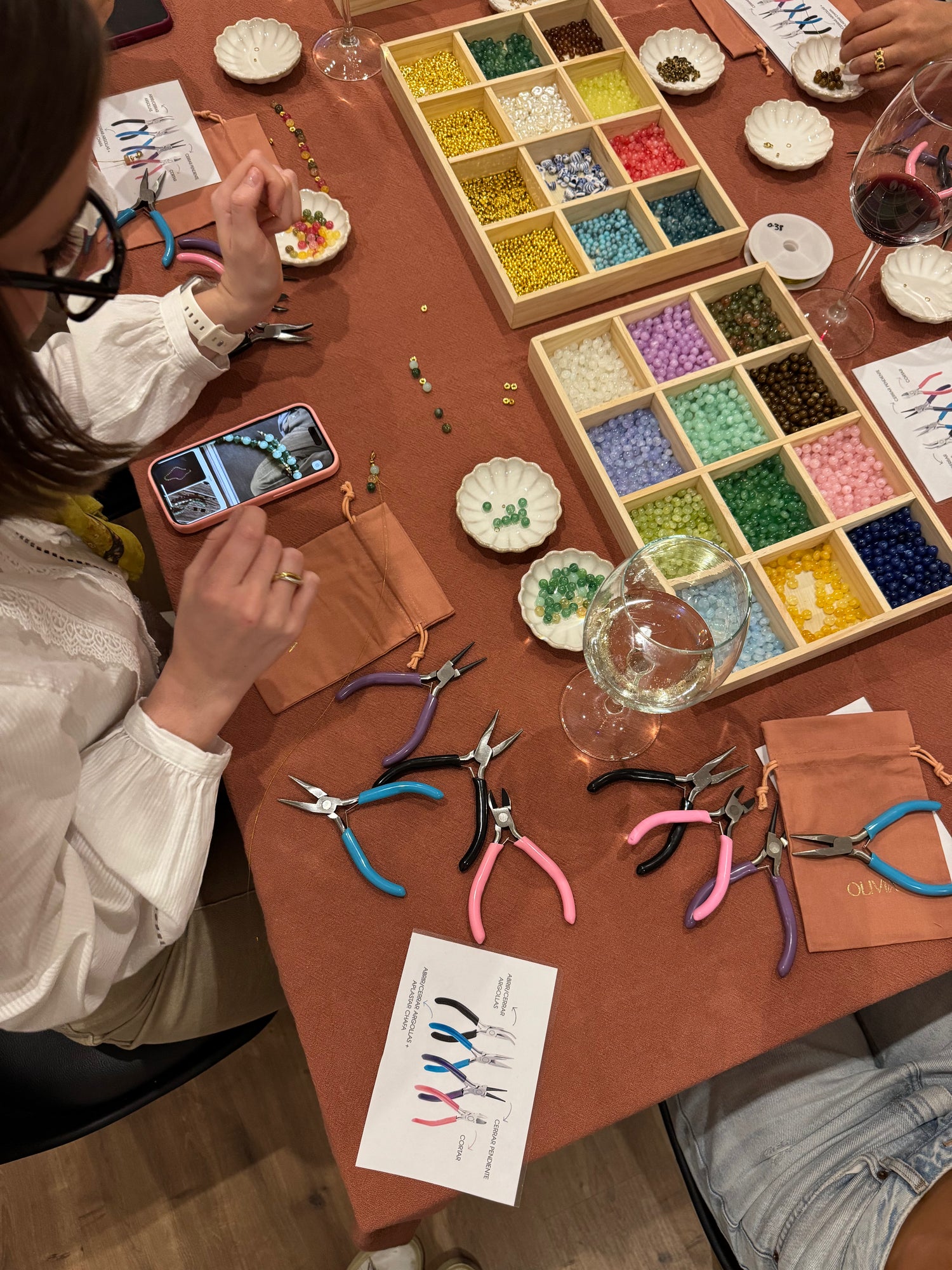 Te proporcionamos todo el material: cuentas de cerámica, piedras, conchas, charms, alicates, herramientas… y por supuesto, una copa en la mano mientras diseñas tus piezas.